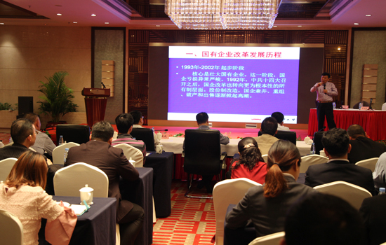 在两个小时的讲座中,主讲人紧紧围绕培训主题“国企改革转型背景下的创新发展”,分两大部分展开授课。第一部分,主讲人系统回顾了国有企业改革发展历程,深入阐述了国企改革的基本原则、难点特点、总体趋势和五大举措,并对国有企业职能定位、薪酬体系改革、混合所有制改革等因素做了细致分析。通过列举省内企业改革的生动案例,加深了在场学员对相关问题的理解和把握。他强调,国有企业的发展壮大,必须放在国际国内宏观经济形势和全面深化改革的大背景下,在全面客观分析中国经济当前面临机遇和挑战的基础上,进行谋划布局。第二部分,主讲人针对改革背景下突出国有企业管理创新的现实问题,根据自己的研究成果和理论思考,提出了具有针对性和实效性的四大建议:一是政企分离、完善法人治理。通过理顺体制机制和加强制度建设,紧紧抓住国有企业的“二重性”即公共性和企业性,促进企业的良性经营和持续发展。二是战略导航、构建管理机制。培育战略思维,围绕企业发展的五个基本问题提出解决方案。三是因事求人、规范职位管理。以人力资源管理优化为核心,运用多种有效手段解决工作目标与人员能力之间的结构性矛盾。四是全面激励、构建和谐关系。将物质激励与精神激励、感情激励等有机结合,着眼员工多元化需求提高激励的有效性。