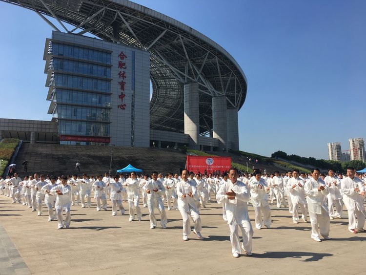 9月14日上午,“2017世界百城千万人太极拳展演合肥站”活动启动仪式在合肥奥体中心举行。在合肥体育中心北广场,千人太极展演拉开帷幕,气势宏大,太极拳爱好者随着轻柔舒缓的经典音乐拉开动静相彰的太极画卷,拳友以精神抖擞,拳术精湛、动作优美刚劲整齐划一,队形变化巧妙,一招一式娴熟认真的拳姿演绎着太极文武兼修的魅力,传播了“共享太极,共享健康”的生活理念,推动合肥全民健身运动发展,也为太极拳申遗助力。