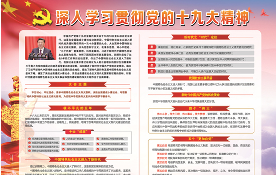 本次“学习宣传贯彻党的十九大精神”主题宣传展板共6块,以党的十九大报告为主线,从多个角度展现十九大精神的丰富内涵。展板包括党的十九大报告解读,以关键词的形式从大会主题、极不平凡的五年、中国特色社会主义进入了新时代、我国社会主要矛盾、新时代中国共产党的历史使命、新时代中国特色社会主义思想八个“明确”、新时代坚持和发展中国特色社会主义的基本方略、新时代党的建设总要求等18个方面对报告进行解读;包括第十九届中共中央组织结构图、党的十九大《中国共产党章程(修正案)》解读、习近平新时代中国特色社会主义思想解读和十八届中央纪委向党的十九大的工作报告解读。展板图文并茂,既有一定的理论深度,又有直观、生动的特点,达到了内容和形式的统一,受到公司干部职工的一致好评。