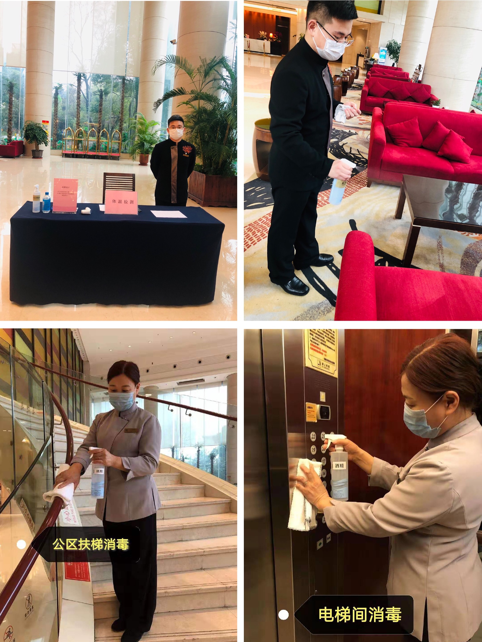 加大对疫情及防护措施宣传力度,制定和落实防护措施。对酒店所有区域以及员工宿舍进行不间断消毒,要求所有人员必须佩戴口罩上岗。在酒店门口增加体温检测点,对进入酒店人员进行体温检测,并做好记录,如发现异常及时上报并做好防范措施。对餐饮营业时间进行调整,暂停中餐厅营业,无条件响应“退订”政策。每日汇总员工身体状况,密切关注疫情发展并采取有力措施加以应对。