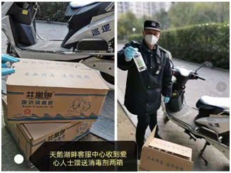 政文外滩物业自2月4日,天鹅湖畔小区收到第一笔爱心捐赠——两箱共60瓶消毒酒精起,各项目陆续收到爱心业主的捐赠,或防护面罩、护目镜,或医用酒精、消毒液,爱心业主的每一个小小举动,都感动政文外滩物业人迈步前行,一份份爱心,一股股暖流,一份份义举,在疫情面前弥足珍贵,都化作抗击疫情的希望和力量。
