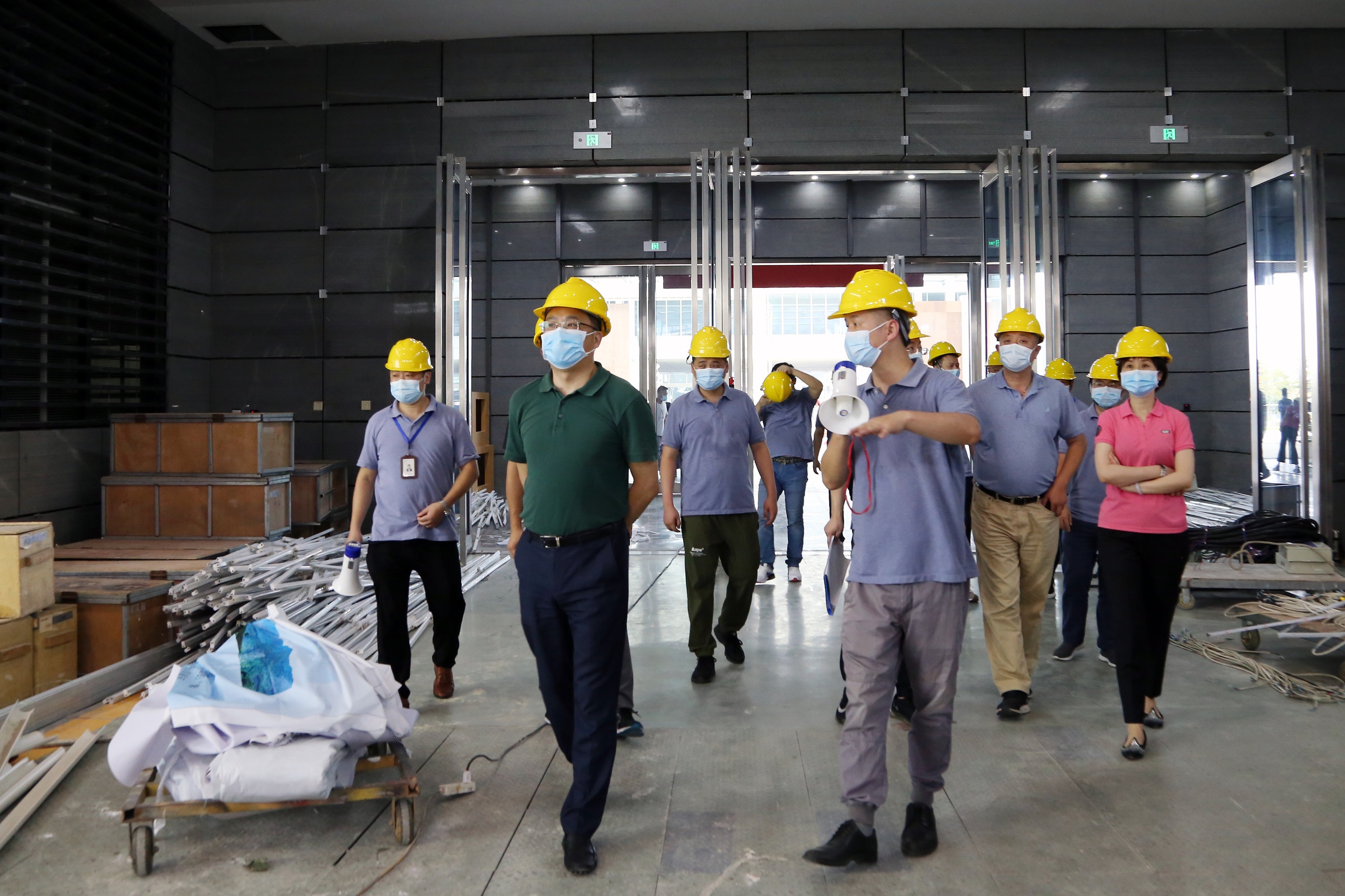8月26日,政文会展负责人文良武带领公司中层以上管理人员进行展前检查,先后到滨湖会展中心登录大厅、一号道口、场馆内部,现场体验展会入场流程,查看布展情况,检查疫情防控措施落实情况。据悉,观众入场须从一号道口测体温、扫安康码、扫行程码,再经6号馆安检处复测体温,查验安康码、行程码,身份证核验,随身物品安检后进入场馆。文良武强调,各环节必须严格按流程操作,决不可大意松懈,确保为参展商和观众营造安全舒心的参展环境,保障展会布、开、撤展全过程安全顺利。
