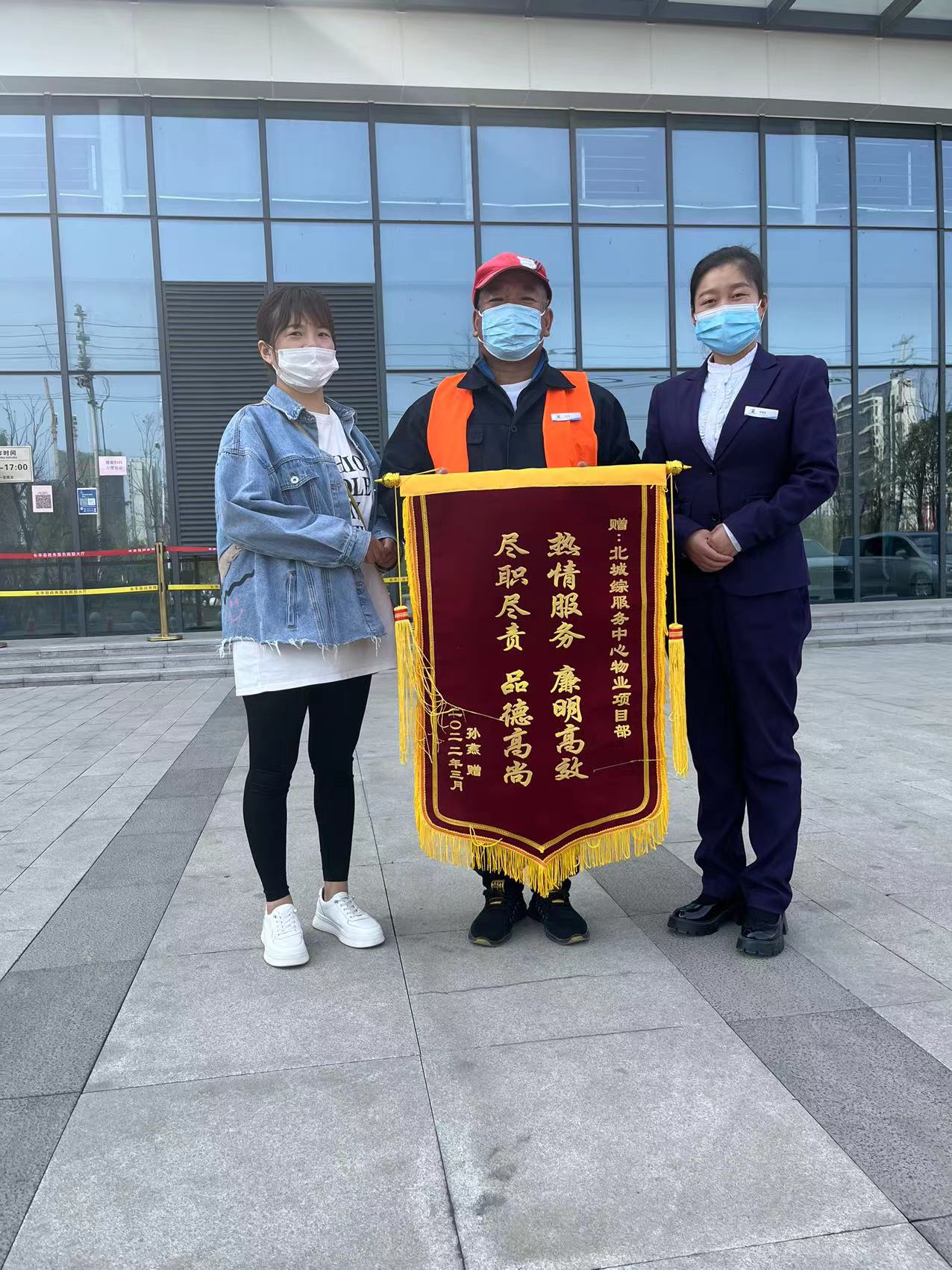 2022年3月15日,北城综合服务中心物业项目部收到一面印有“热情服务、廉明高效、尽职尽责、品德高尚”的锦旗,以表达失主对项目部保洁员朱干成及项目管理处的感激之情。