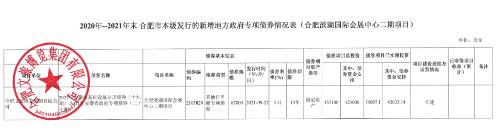 2021年度政府债券存续期信息公开(合肥滨湖国际会展中心二期项目)