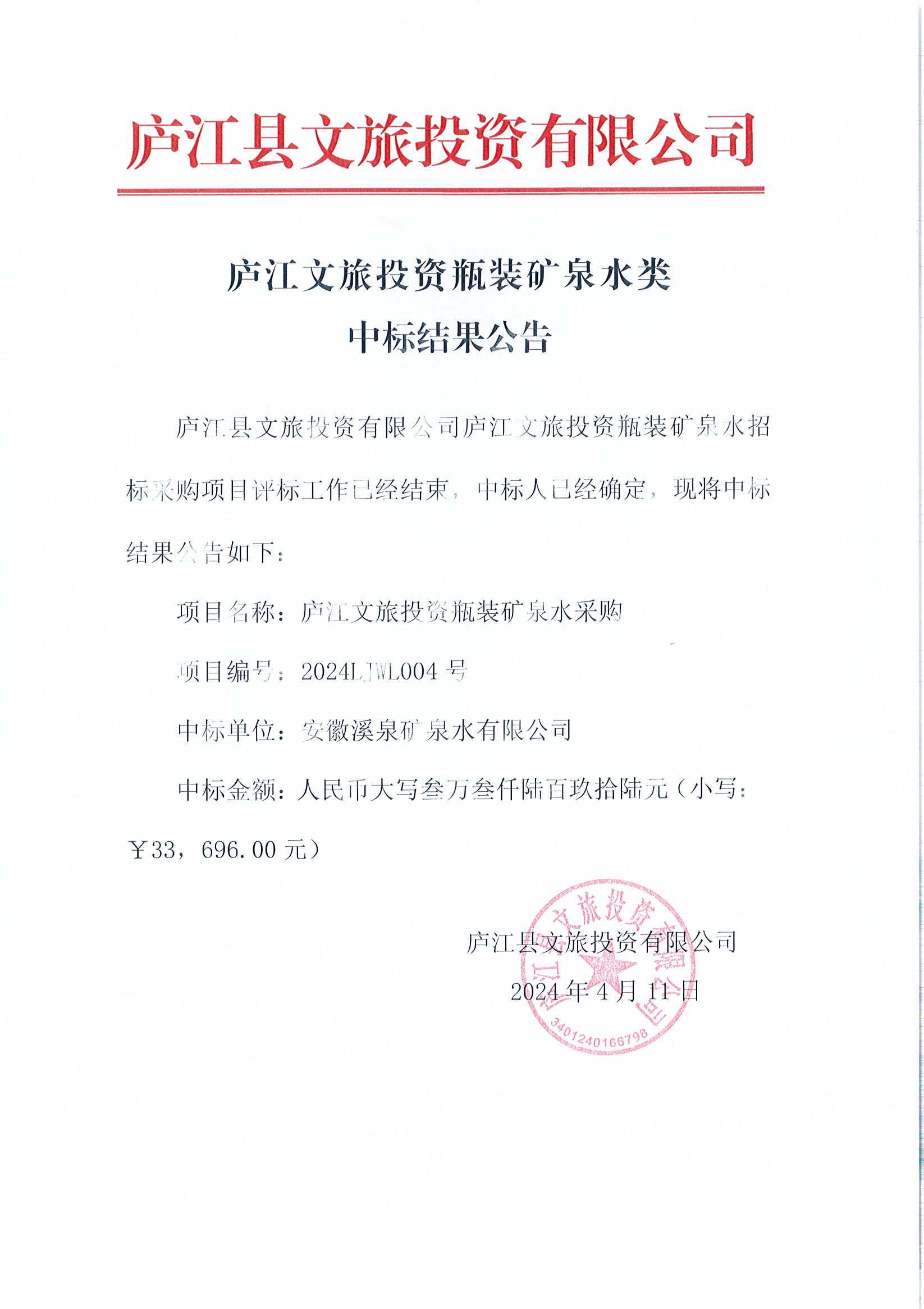 庐江文旅投资瓶装矿泉水类中标结果公告