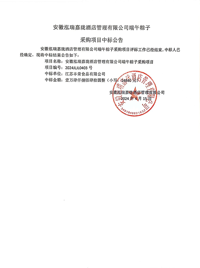 安徽泓瑞嘉珑酒店管理有限公司端午粽子采购项目中标公告