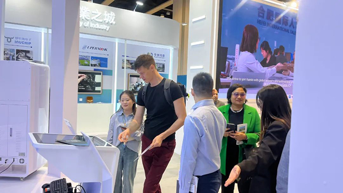 同时,现场部分展品需要互动性展示:联动东超科技的空气成像触控功能、孪生宇宙的AI虚拟人讲解功能会呈现在京东方miniled大屏上;科大讯飞的星火大模型联动京东方大屏,达到实时互动对话效果;灵盼科技的ai眼镜结合现场参展企业和展品,制作交互式引导的游览方案......通过这些巧妙的设计展示,将合肥展区打造成了形神兼备的科创应用场景,增强现场互动体验,达到吸引观众的注意力并突出企业特色、展品特点的效果。