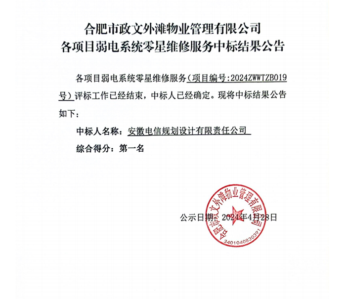 合肥市政文外滩物业管理有限公司各项目弱电系统零星维修服务中标结果公告