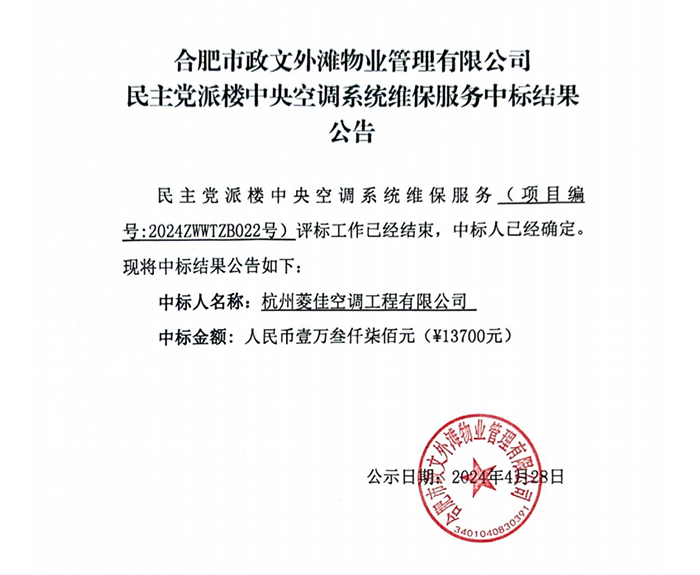合肥市政文外滩物业管理有限公司民主党派楼中央空调系统维保服务中标结果公告