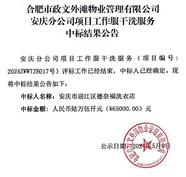 合肥市政文外滩物业管理有限公司安庆分公司项目工作服干洗服务中标结果公告