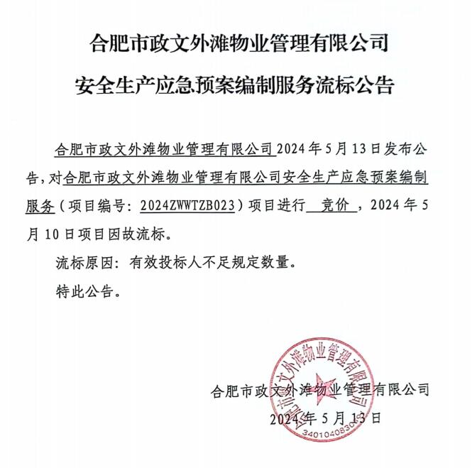 合肥市政文外滩物业管理有限公司安全生产应急预案编制服务流标公告
