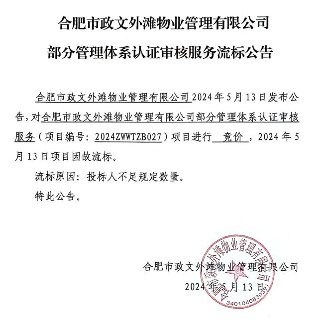 合肥市政文外滩物业管理有限公司部分管理体系认证审核服务流标公告