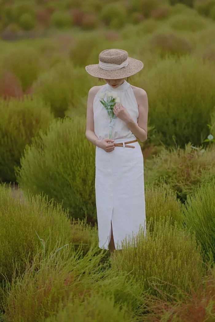 她穿着白色的连衣裙