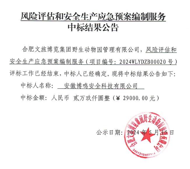 合肥文旅博览集团野生动物园管理有限公司风险评估和安全生产应急预案编制服务中标结果公告