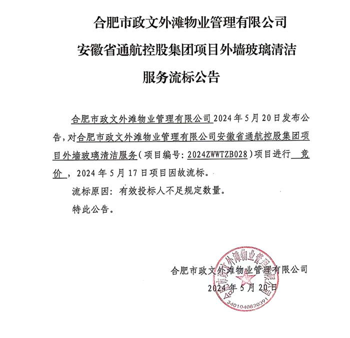 合肥市政文外滩物业管理有限公司安徽省通航控股集团项目外墙玻璃清洁服务流标公告