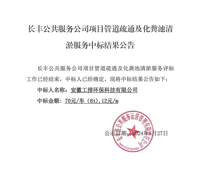 长丰公共服务公司项目管道疏通及化粪池清淤服务中标结果公告