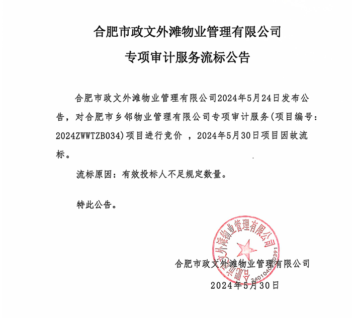合肥市政文外滩物业管理有限公司专项审计服务流标公告