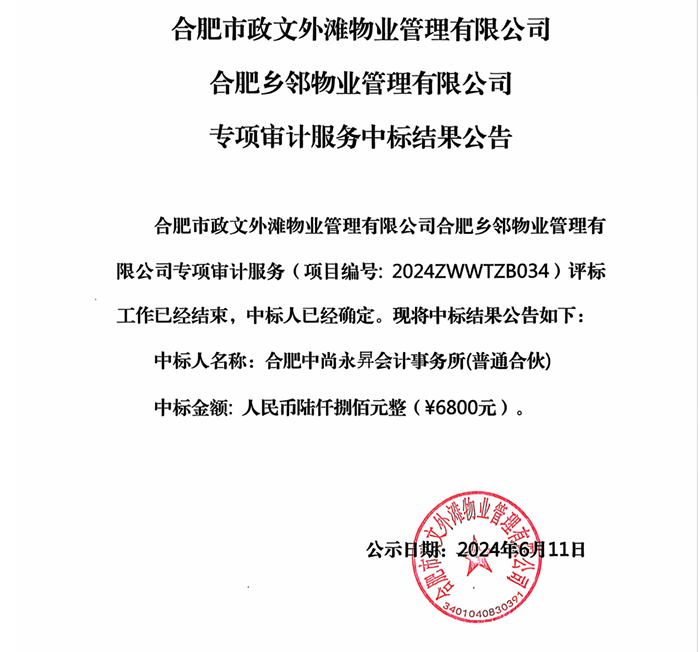 合肥市政文外滩物业管理有限公司合肥乡邻物业管理有限公司 专项审计服务中标结果公告
