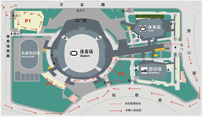 观看NBL联赛安徽合肥赛区(安徽文一主场)的球迷,车辆从西北门和南西门进入体育中心后,停在P1/P2/P3停车场。
