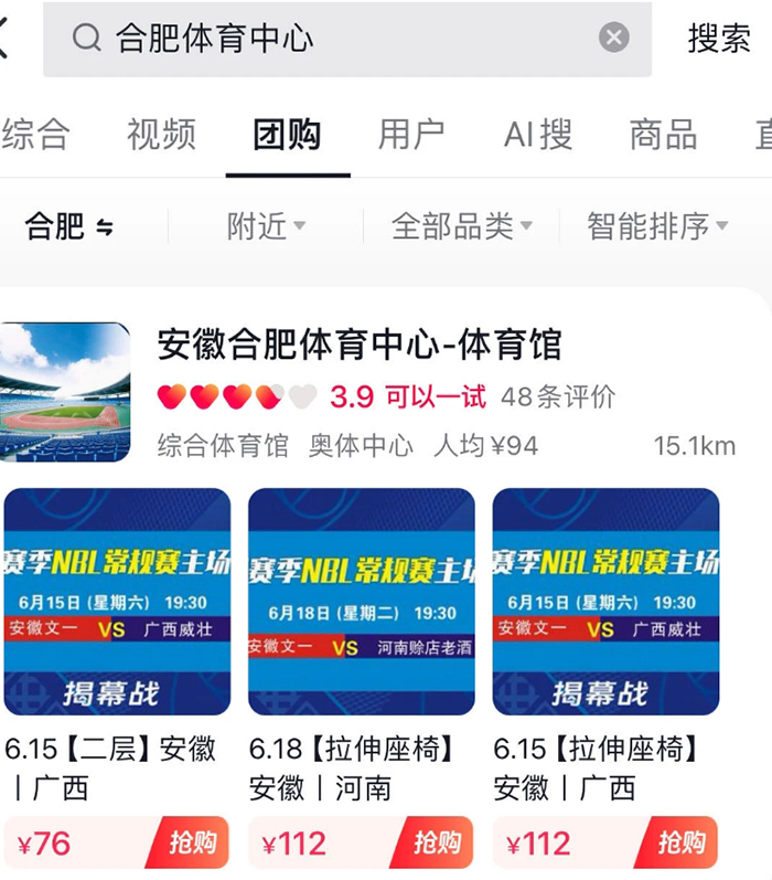 二、在抖音中搜索“合肥体育中心”,也可团购本场比赛球票。
