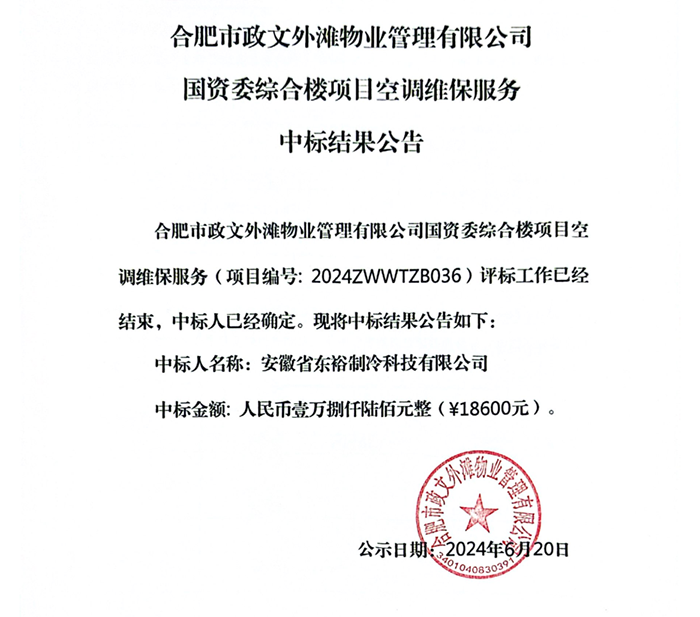 合肥市政文外滩物业管理有限公司国资委综合楼项目空调维保服务 中标结果公告