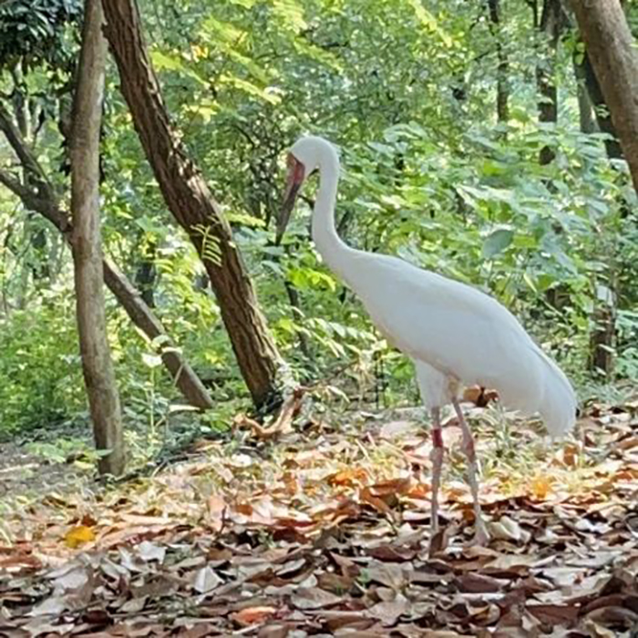 百鸟园的林间,白鹤正在闲庭信步的觅食