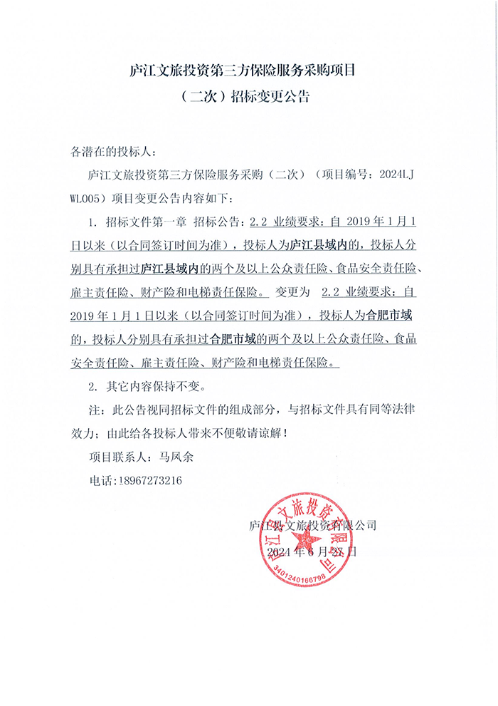 庐江文旅投资第三方保险服务采购项目(二次)招标变更公告