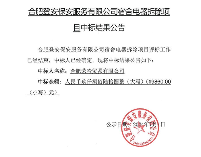 合肥登安保安服务有限公司宿舍电器拆除项目中标结果公告