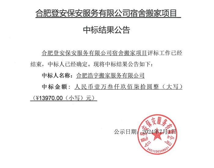 合肥登安保安服务有限公司宿舍搬家项目 中标结果公告