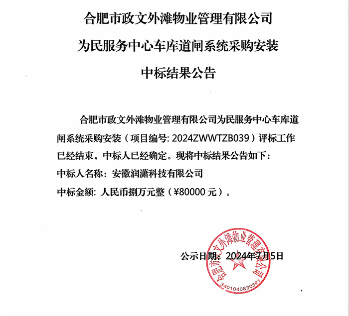 合肥市政文外滩物业管理有限公司为民服务中心车库道闸系统采购安装中标结果公告