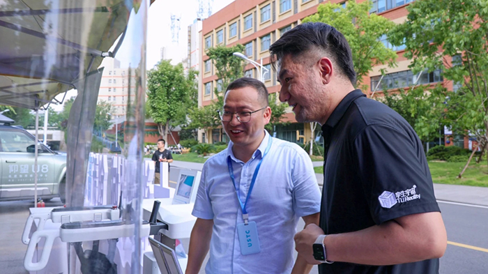展区一角,合肥孪生宇宙科技有限公司自主研发的深度全息舱,吸引了大量校友驻足观看。“配置的虚拟人高度拟人化,还具有主动交互、实时学习等功能,尽显智能魅力。”中国科大校友邢荣勤特意从苏州赶到合肥,参加这一活动。