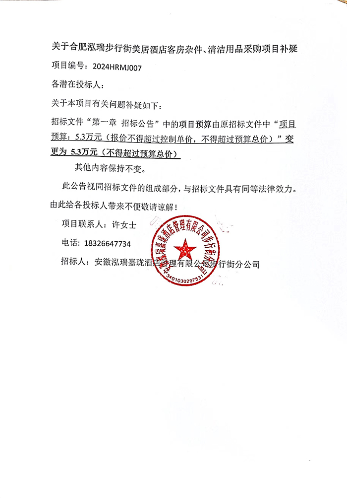 关于合肥泓瑞步行街美居酒店客房杂件、清洁用品采购项目补疑