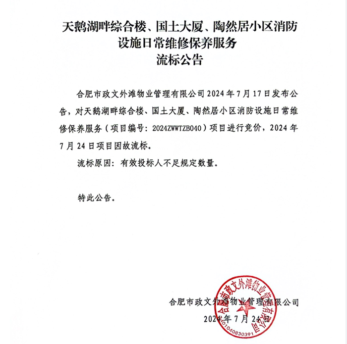 天鹅湖畔综合楼、国土大厦、陶然居小区消防设施日常维修保养服务流标公告