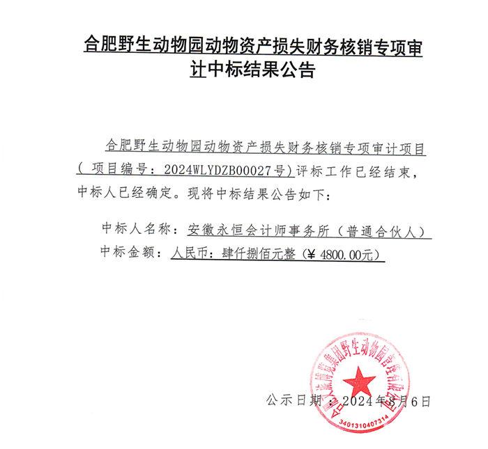 合肥野生动物园动物资产损失财务核销专项审计中标结果公告
