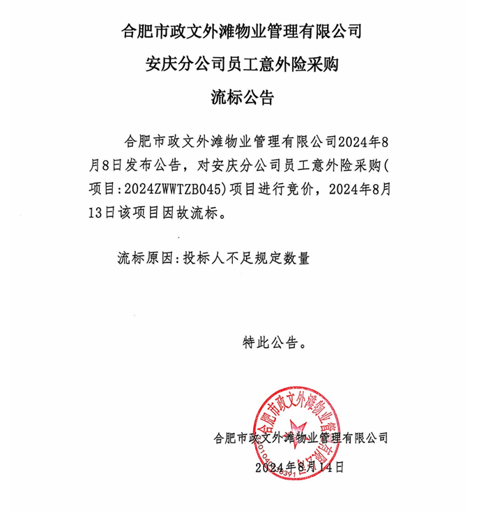 合肥市政文外滩物业管理有限公司安庆分公司员工意外险采购流标公告