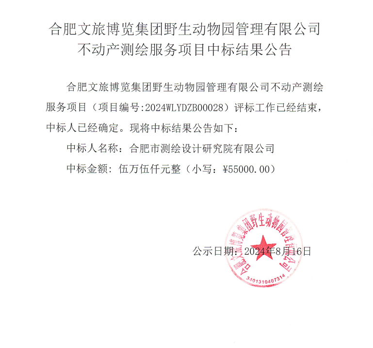 合肥文旅博览集团野生动物园管理有限公司不动产测绘服务项目中标结果公告