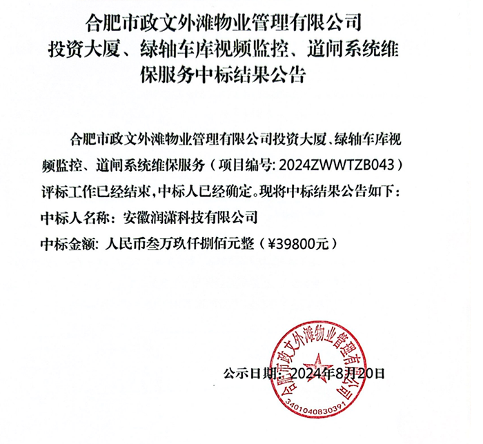 合肥市政文外滩物业管理有限公司投资大厦、绿轴车库视频监控、道闸系统维保服务中标结果公告