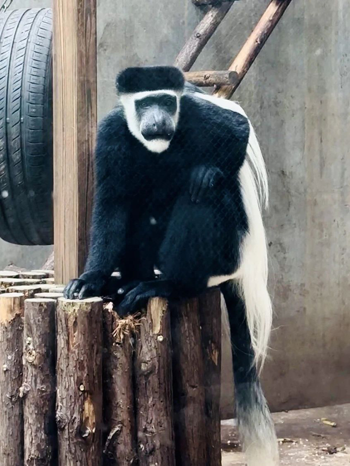 合野的东非黑白疣猴圈舍在园区的最北端,景观桥北端桥头附近,这里主要生活着两个东非黑白疣猴家族,大黑三黑一家和好黑老白一家(咱们的起名主打一个朴实无华),一个群体由一只成年雄性+几只雌性+幼崽组成,一般雌性会共同育幼。