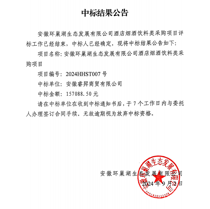 安徽环巢湖生态发展有限公司酒店烟酒饮料类采购项目