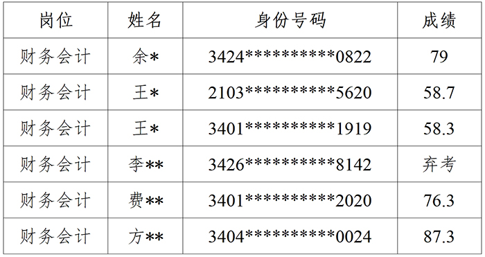 根据《合肥文旅博览集团所属企业合肥百姓公共服务云平台有限公司2024年社会公开招聘公告》有关要求,现将面试成绩公示如下: