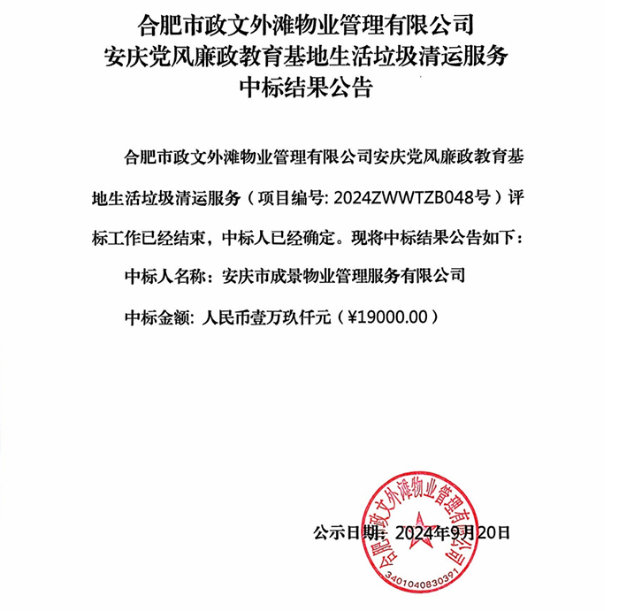 合肥市政文外滩物业管理有限公司安庆党风廉政教育基地生活垃圾清运服务中标结果公告