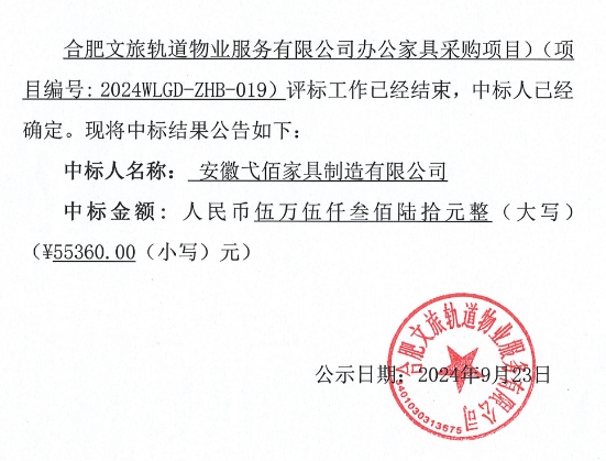 合肥文旅轨道物业服务有限公司办公家具采购项日中标结果公告