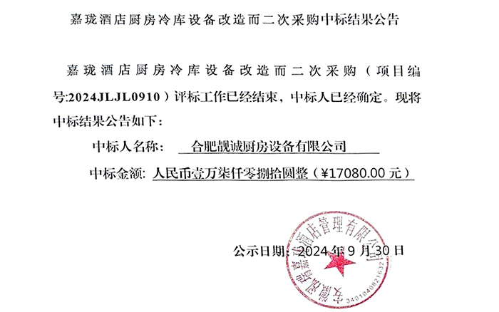嘉珑酒店客房部与餐饮厨房杂件二次采购中标结果公告