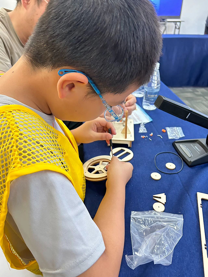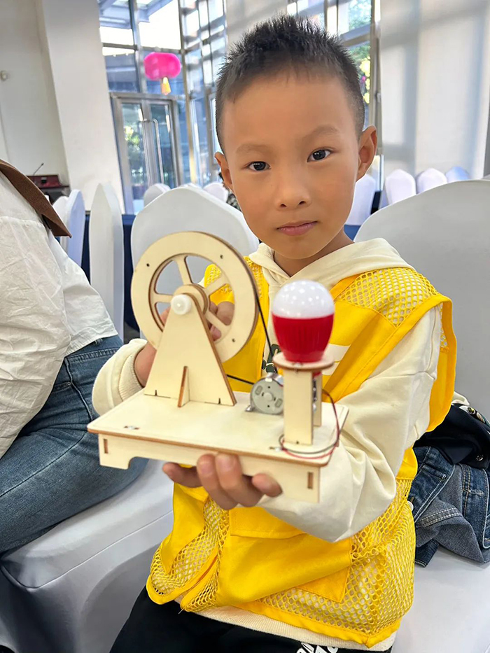 小朋友们转身变成小小工程师,在研学导师的演示下,把发电机模型拼起来,用小手摇啊摇,“咻”的一声,动能变成了电能,小灯泡亮了,小朋友的好奇心也被点燃了。