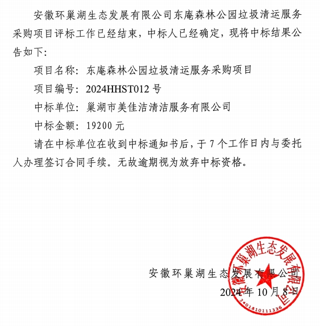 安徽环巢湖生态发展有限公司东庵森林公园垃圾清运服务采购项目中标结果公告