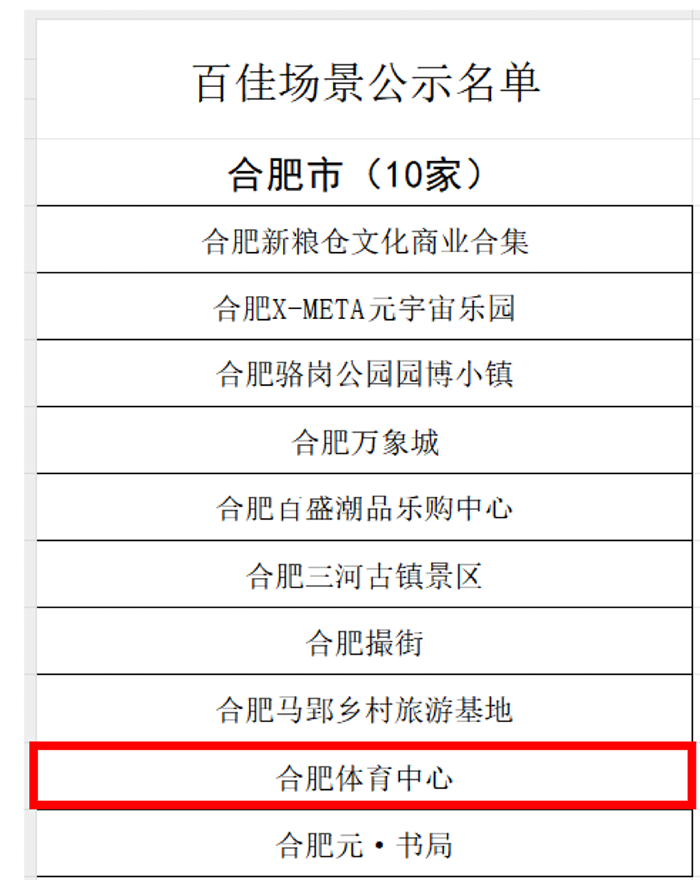 自七月份活动启动以来,共有337家场景企业申报参与,经过市县遴选、区域比选、线上投票、专家评议等流程,共评选出“悦在运动”等十大领域皖美消费新场景100家。其中,合肥体育中心光荣上榜!