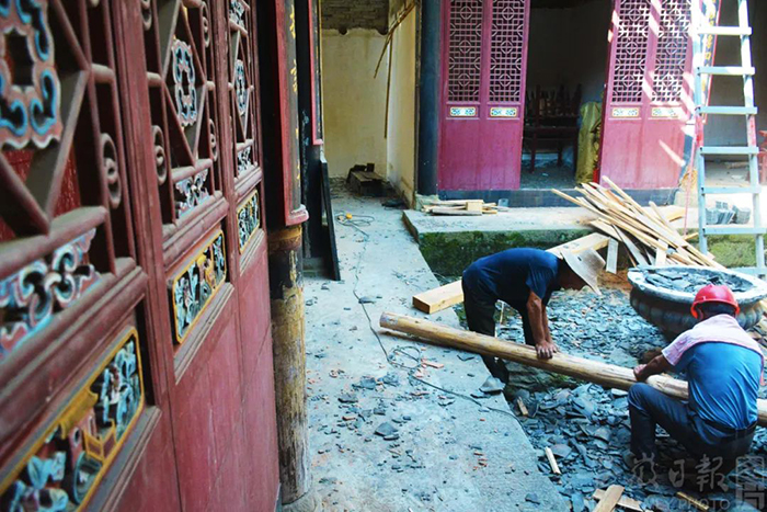 6月18日,工人们在安庆市岳西县响肠镇修缮古建筑。吴均奇 摄