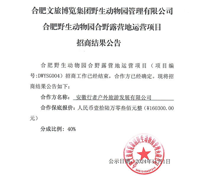 合肥文旅博览集团野生动物园管理有限公司合肥野生动物园合野露营地运营项目招商结果公告