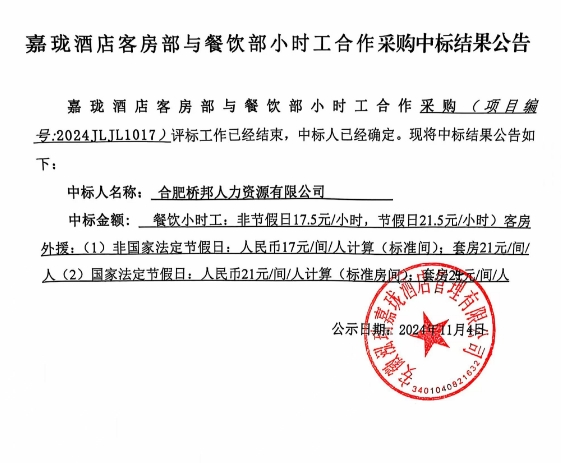 嘉珑酒店客房部与餐饮部小时工合作采购中标结果公告