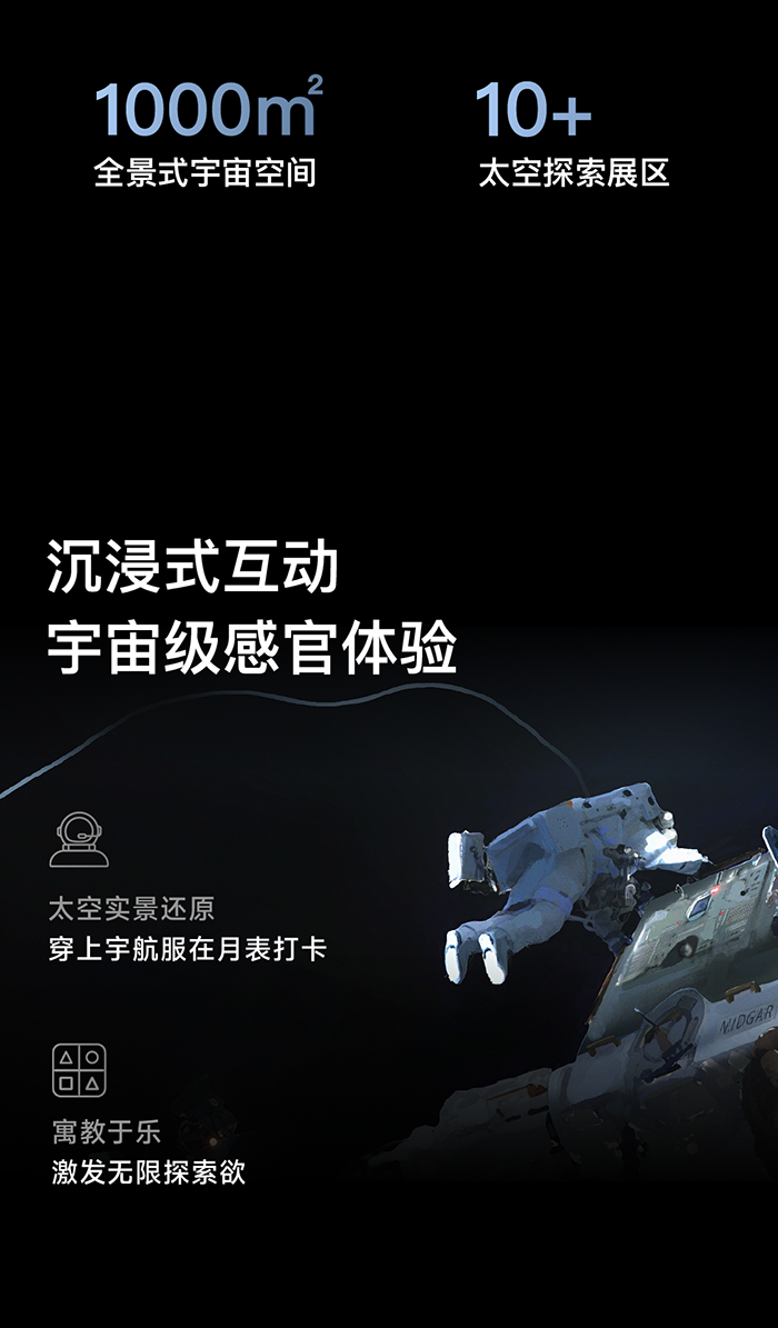 换上宇航服,掀开“航天档案”进入“太空电梯”,抵达太空空间站跨入“星际桥梁”,沉浸式“探秘太阳系”,与星球擦肩而过感受每一颗星球的独特魅力...
